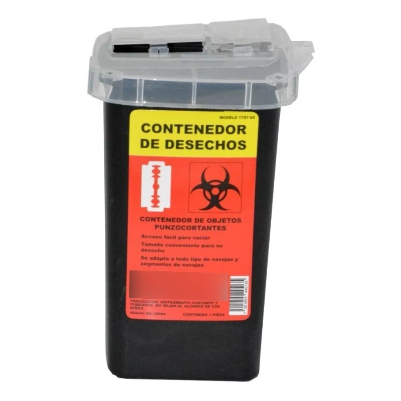 Contenedor desechable seguro para agujas, jeringas, lancetas, navajas y objetos filosos.