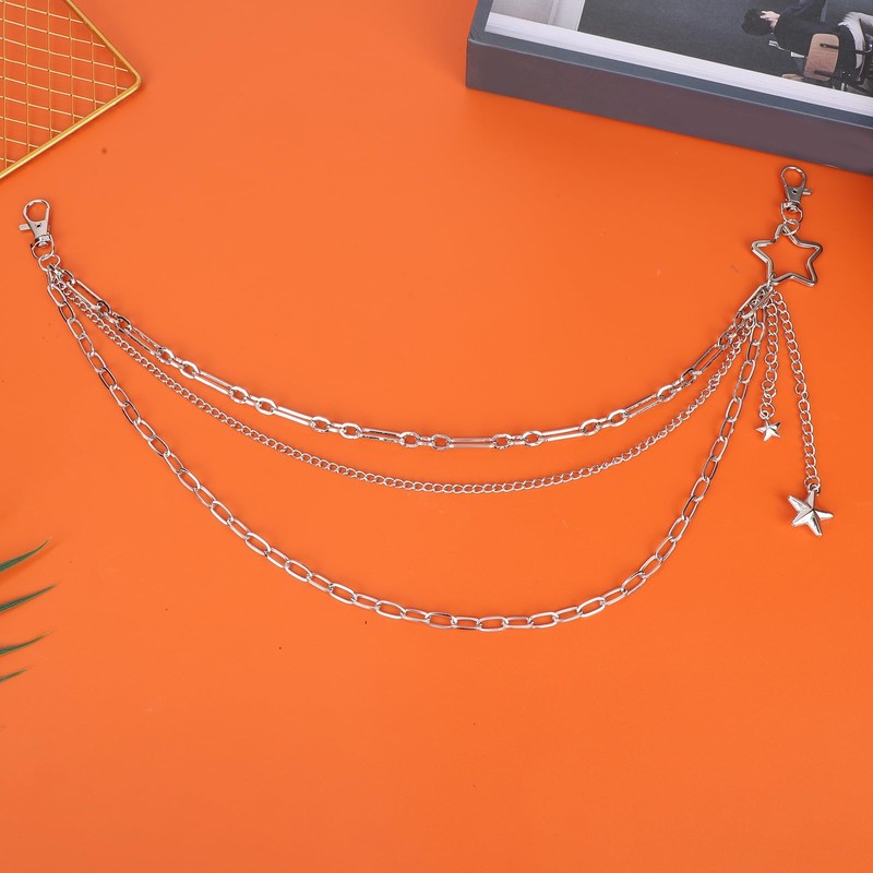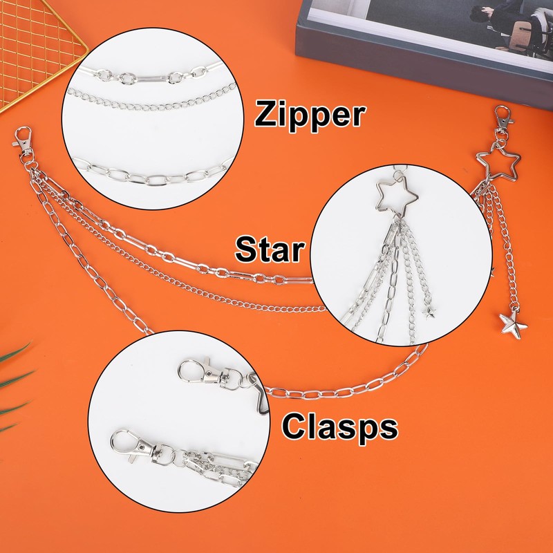 - Special Design: This silver jeans chain adopts a fashionable and personalized design, and each layer of the chain has different shapes and thicknesses, showing a rich level. One end is embellished with stars, which perfectly blends punk and fashion aesthetics.