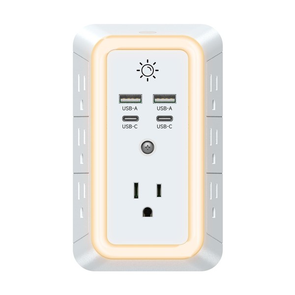 7 adapter spacing outlets, 2 USB fast charging ports and 2 USB C ports, and the night light feature makes it easy to see the outlet in dark corners or at night, making it perfect for use in a home or office area.