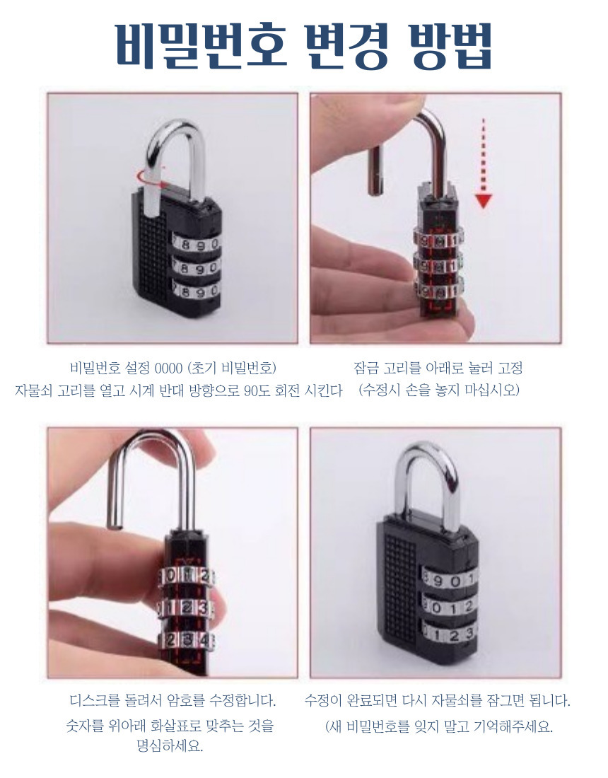 - How to Change Combination: Push the shackle down and hold. With the shackle open, rotate it 90 degrees counter-clockwise (do not release your grip during modification). Turn the dials to set your new combination. Close the shackle to finish.