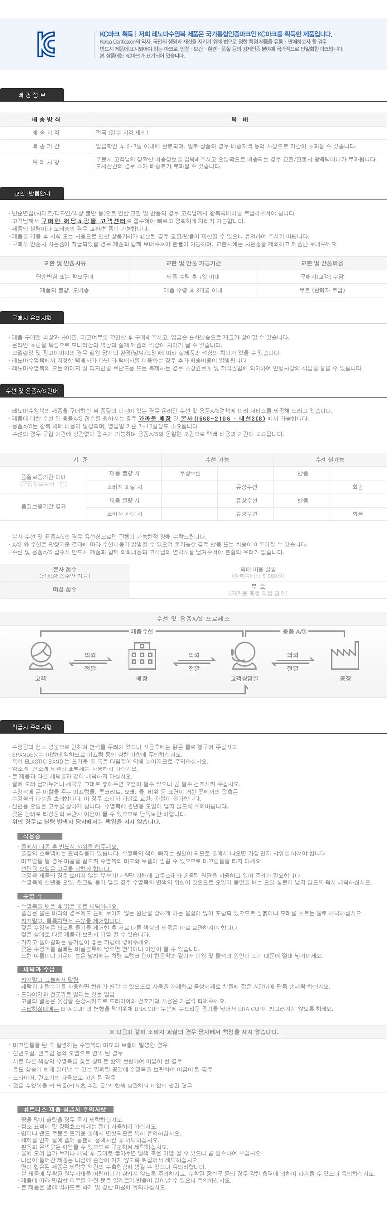 | 반품 주소 | 충남 천안시 서북구 공원로 196 천안모다아울렛점 3층 레노마수영복 | ||