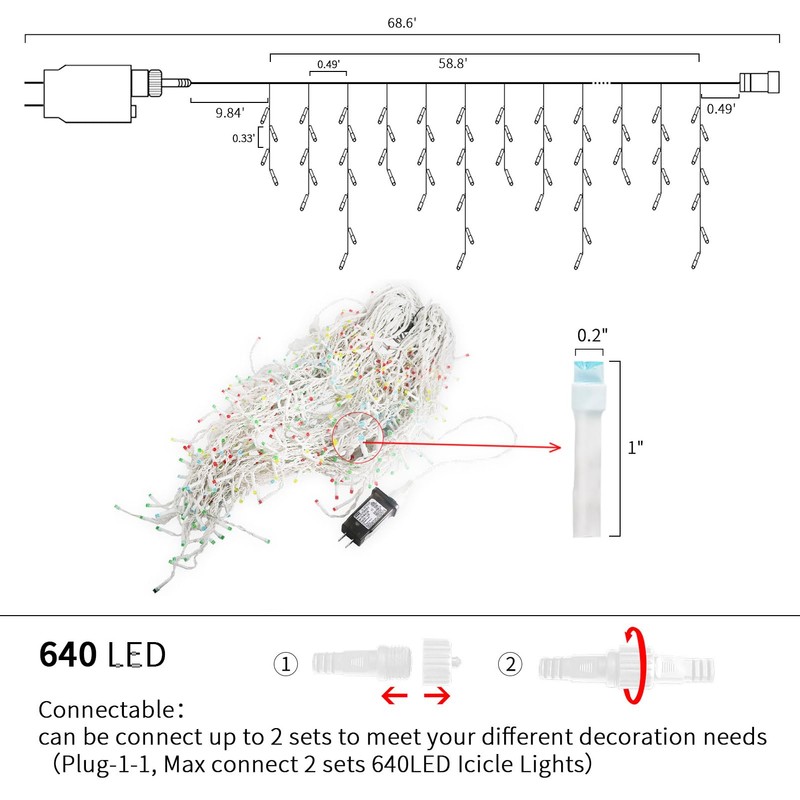 - 【High-End Icicle Lights Specification & Connectable】: The christmas icicle string lights includes 640-count quality mini clear led lights, total length is 68.6ft with 120 drops, lights length is 58.8ft and each led is 0.33ft apart, 9.84ft lead wire, distance between drops is 0.49ft, 0.49ft end connector. You can connect extra 1 set for larger decorating projects. Simple tangles for icicle lights, easy to unfasten and hang.