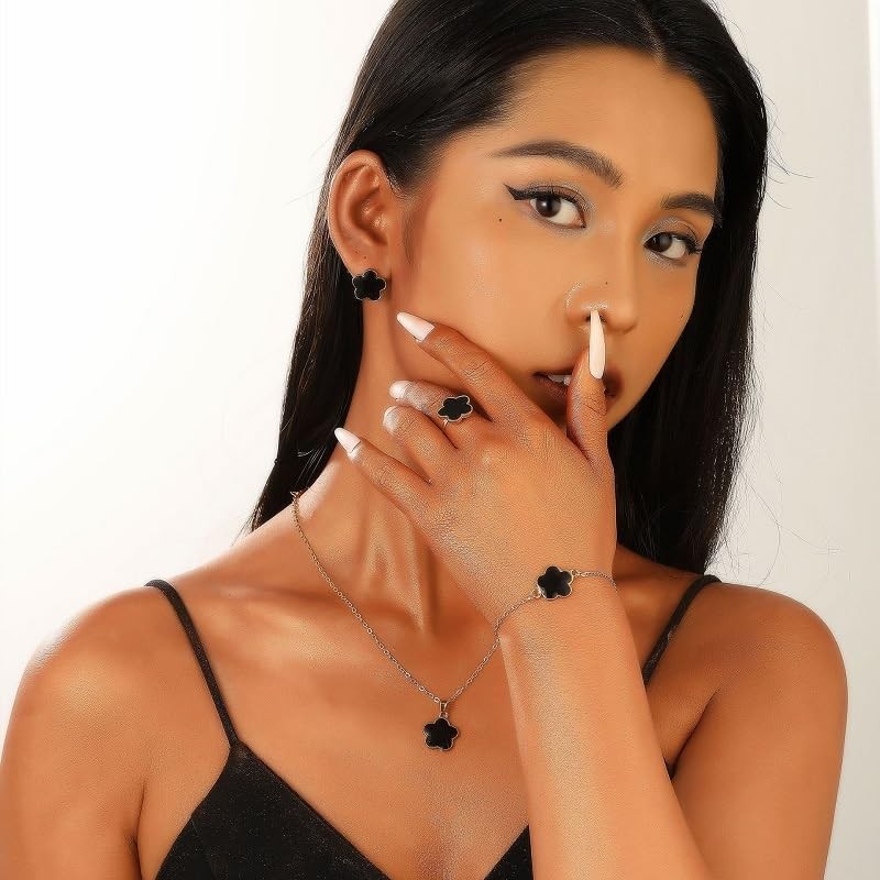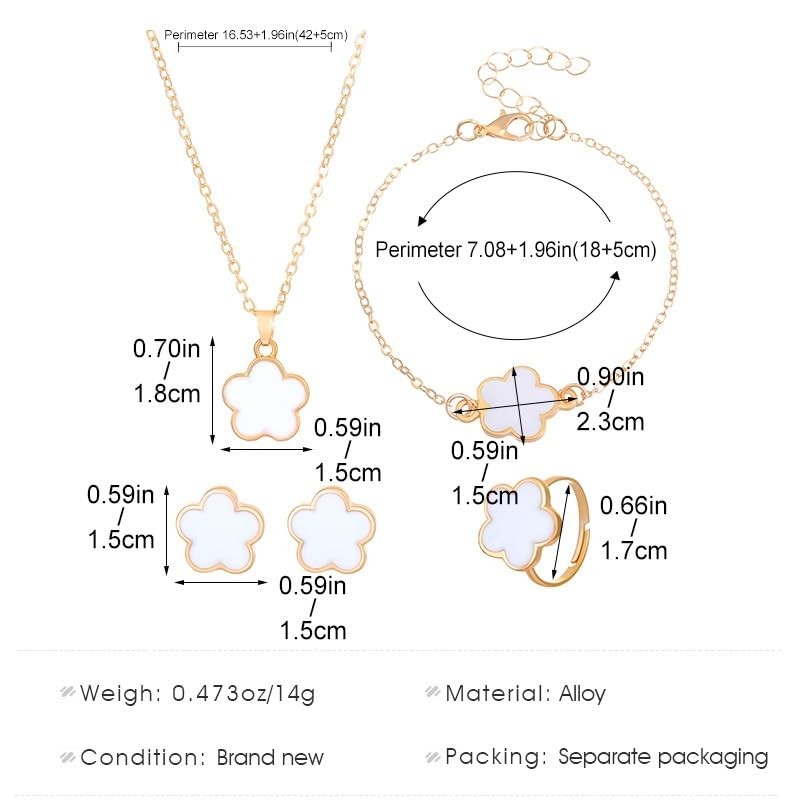 Multicolor Five-leaf Clover Blossom Flower Earrings Necklace Bracelet and Ring Set Lucky Five-leaf Blossom Flower Jewelry Set for Women, Zinc, No Gemstone