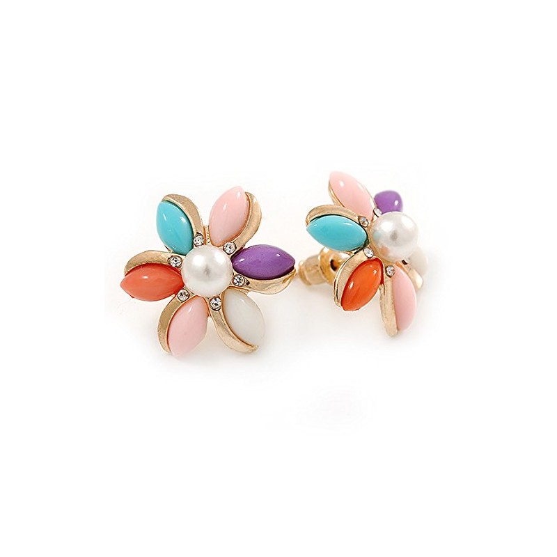 Multicoloured Acrylic, Crystal Flower Stud Earrings In Gold Tone - 20mm D