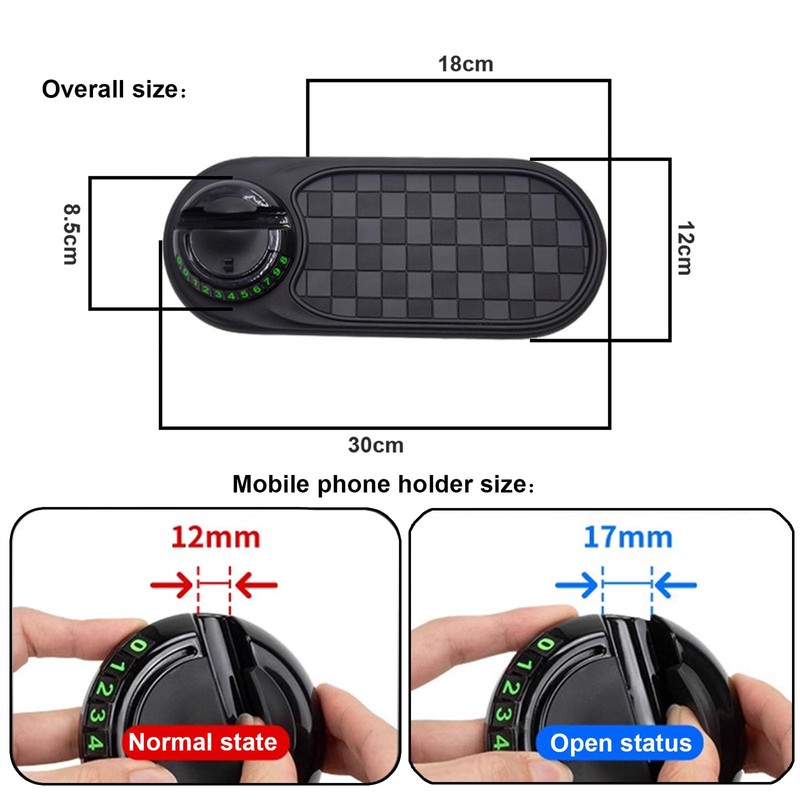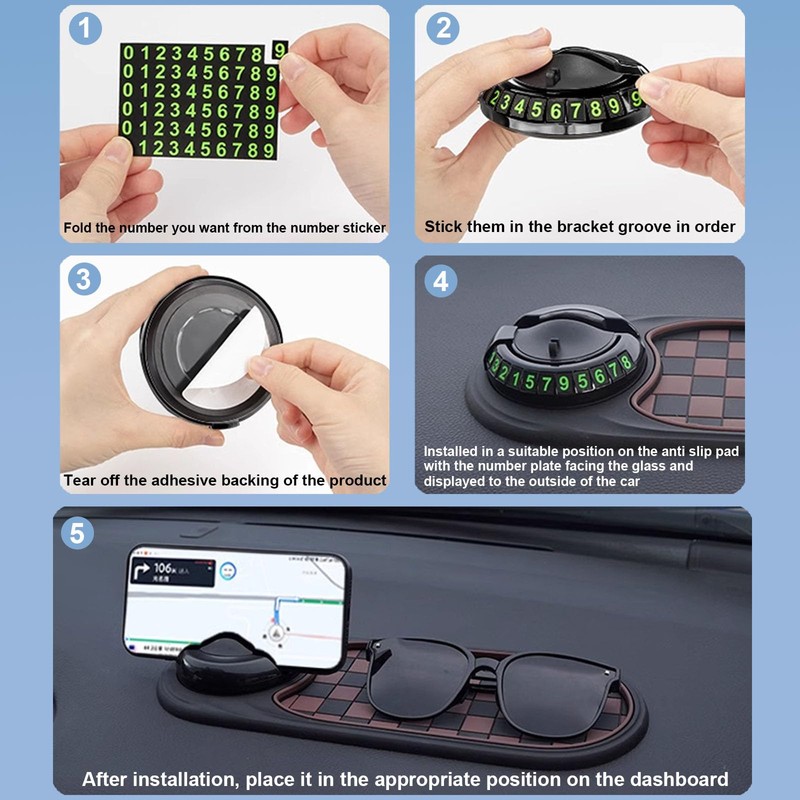 - 【Multi-Function Design】The dashboard storage pad base comes with 6 sets of temporary parking number stickers, which are convenient for displaying your contact information when you park. At the touch of a button, the hidden number plate is revealed, the numbers are enlarged to be clear and eye-catching, and can be seen at a glance out of the car window.