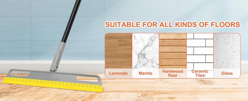 - 【Multifunction Scraping Broom】This squeegee broom for floor can dry floor surface efficiently and remove sweep the dust, hair, pet hair, water, oil, foam, etc. It can be used in the kitchen, living room, bathroom, garage, pool, suitable for smooth floors, concrete, tile, carpet, marble, glass, and hardwood floor without scratching.