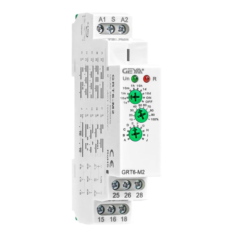 - TEN SPECIAL FUNCTION & APPLICATION: GRT6-M2 multifunctional timer relay, can preset machine start or stop time, 5 time functions controlled by power supply voltage, 4 time functions controlled by control input, 1 latching relay function. It has a wide delay setting range from 0.1 seconds to 10 days, with a rated operating voltage of AC230V (50-60Hz), rated current of 10A. Output contact: 2SPDT (2NO2NC). This 230V time delay relay can be used in industrial equipment, lighting manufacturing, heating element control, motors to accurately control the delay time of lighting, heating, motors, machines, etc
