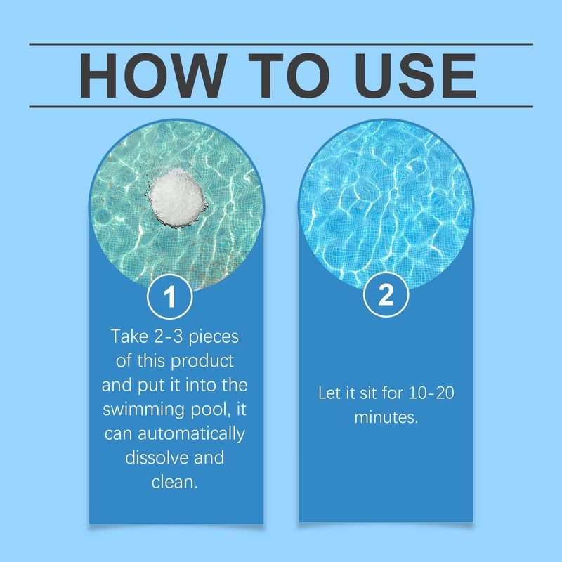 Our pool cleaning sustained-release tablets contain trichloroisocyanuric acid, dichloroisocyanuric acid, and conditioner. It can effectively remove dirt and grease on the surface and bottom of the pool, and keep the pool water clear and transparent. Prevent the formation of scale and stains and keep the pool walls clean and smooth. Its use method is very simple: 1. Take 2-3 pieces of this product into the swimming pool, can automatically dissolve and clean. 2. Let it sit for 10-20 minutes. Pool cleaning sustained-release tablets remove odors from the water, make the pool water fresh and pleasant, and improve the swimming experience.