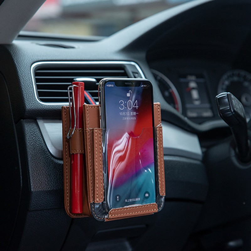 1、HIGH QUALITY MATERIAL -- This Car Vent Storage organizer is made of PU leather.It's soft,comfortable and no smell like leather.Has excellent wear resistance,excellent cold,breathable,anti-aging properties. 2、 4 POCKETS DESIGN -- 1 big pocket for storaging charger, cords, notepads, glasses, and 1 clear pockets for storaging cell phone, 1 open small pocket, 1 pocket for pen or sunglasses. Car Mount Phone keeps your car tidy. 3、 CLEAR POCKET DESIGN -- You can use your mobile phone directly through the storage bag and operate it with one hand, making your driving safer and more convenient. 4、 CONVENIENT CHARGER PORT DESIGN -- We put a cord port on the bottom to have a charging station always at the ready while on-the-go. 5、 EASY TO INSTALL -- The installation is very simple. Simply install and take off, just hang on the car air outlet. Hanging strap can be shorter or longer for best position on the dash.