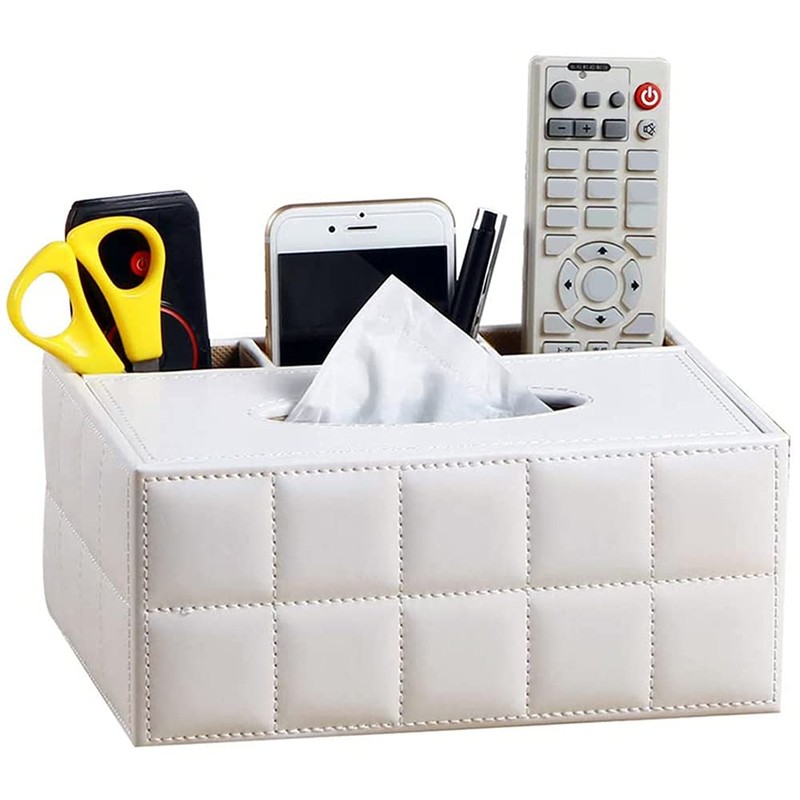 Multifunctional PU Leather Tissue Holder, Rectangular Decorative Tissue Box for Desk, TV, Remote Control, Pens, Mobile Phone, Controller, Kleenex, Home - White