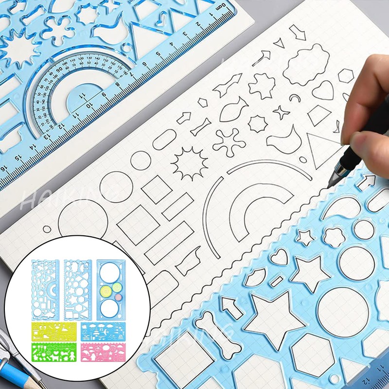 - 【Multi Pattern】 The Multifunctional Ruler has different patterns and shape designs. Such as: curves, straight lines, petals, pentagons, moon, arrow shapes, parallelograms, squares, ellipses, triangles, circles of different sizes, hearts, arcs, etc. More patterns can be drawn through different arrangements.