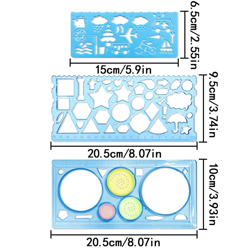 Size: drawing rulers size: 20.5 * 9.5cm/8.07 * 3.74in, spirograph ruler size: 20.5 * 10cm/8.07 * 3.93in, template rulers size: 6.5 * 15cm/2.55 * 5.9in