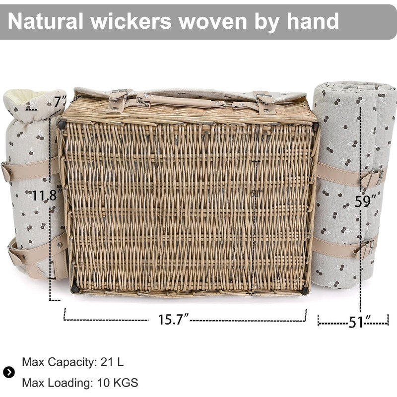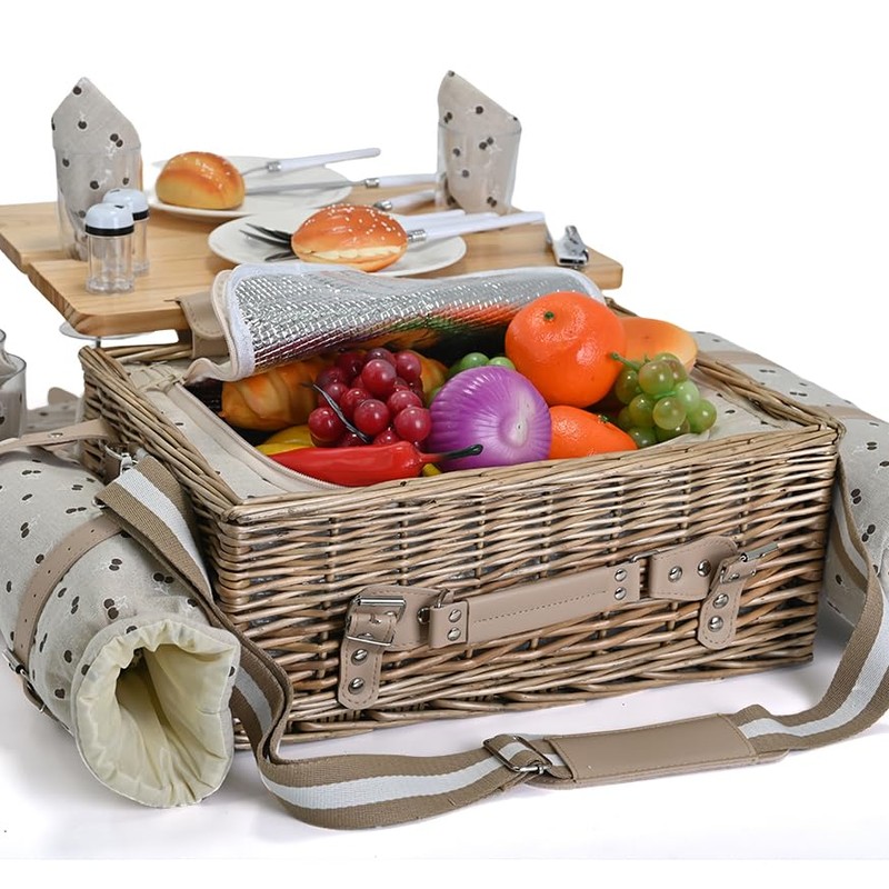 - Versatile detachable picnic kit. The pine lid can be used as picnic table after taking down from the basket