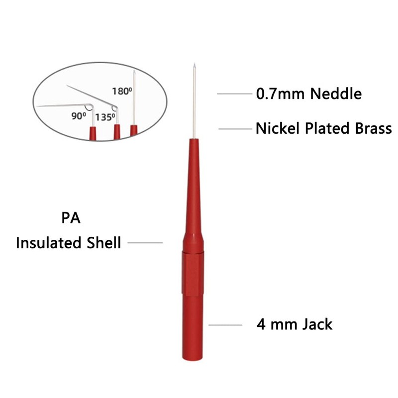Foldable Design The piercing needle of the multimeter with a good copper inner conductor is bendable, can be bent to any angle you want (straight, 45 and 90 degrees), meet different testing requirements. Widely used for electrical testing, car repairs, construction site testing and other non-destructive cable tests. in the laboratory. Simply plug the rear probe pins into the connectors of the wiring, fuel injectors and automotive sensors.