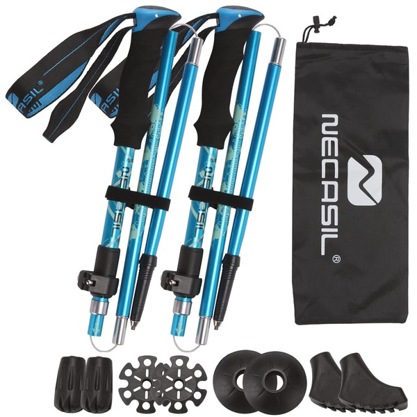 MULTIONS 2本セット 登山ストック 折りたたみ式5節 長さ調整可能 登山用ストック 軽量アルミ製 航空機品質 ウォーキングポール 登山杖 高強度 滑り止め 男女兼用 軽量アルミ製 登山用スティック 徒歩 遠足 収納ケース付属品付き (青)