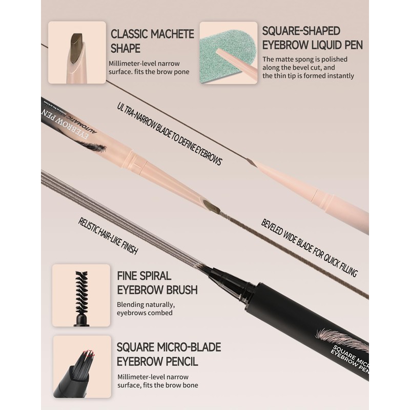 - Eyebrow Makeup Set - Contains dual-ended eyebrow pencil With brush, eyebrow pen with one end for precise shaping and one end for even smudging, comes with a refill when you run out, multi-forked square liquid eyebrow pencil for delicate color filling. It's a one-stop for all your eyebrow needs, so you don't need to prepare anything else to create the ideal shape.