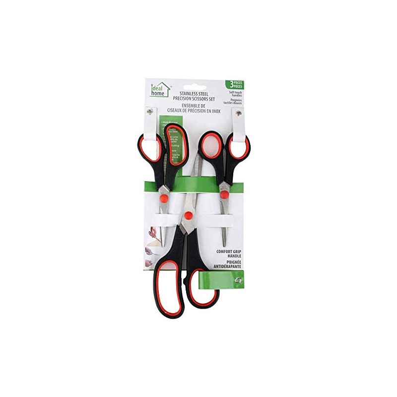About this item: Ideal Home special scissors are suitable for most items that need to be cut. It can also be used as household scissors for cutting open frozen food bags ready for cooking. Convenient, sturdy, especially sharp scissors for general use, very durable. Great for cutting burlap, paper, cardboard, light line, fabric, tape, photos. Perfect for sewing, tailoring, quilting, dressmaking, cutting patterns, alterations, hand crafts. 3 Pairs of Quality Scissors in 3 different sizes allow you to make precise cuts with great control as the blade have the perfect amount of friction. 3 pairs of straight handled scissors for smooth, efficient cutting scissors for general use. Durable stainless-steel blades with high-density steel that makes 3 times harder than normal stainless steel and are smoother cutting. Blades stay sharper longer. Soft-grip holes let you maintain a comfortable, can be used left- or right-handed.