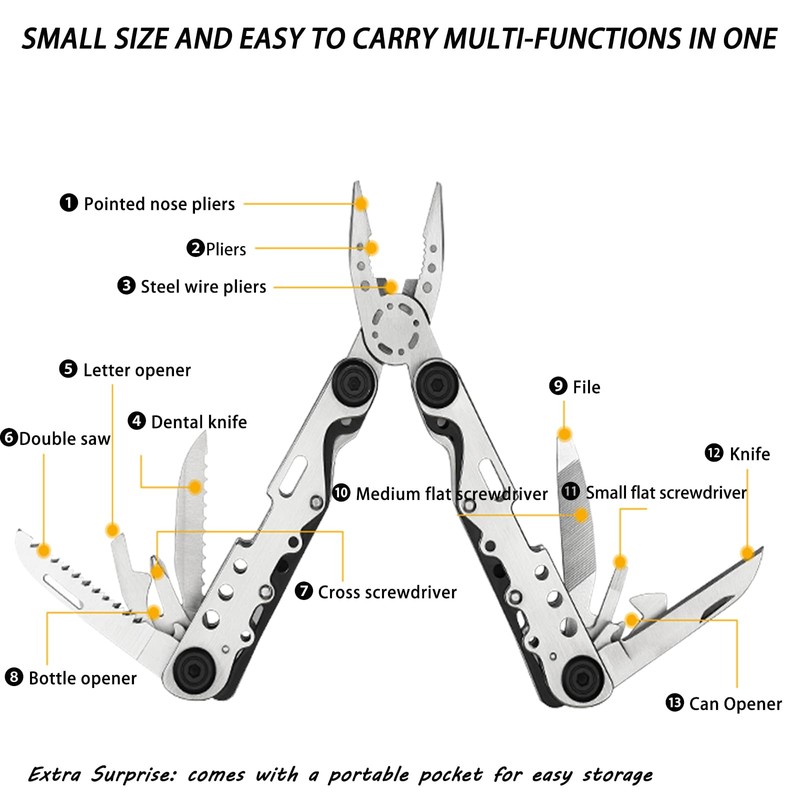 • 13-in-1 Multitool:Multi tool includes mini nose pliers,regular pliers,wire cutters,bottle opener,file,serrated knife,dental knife,medium/small slotted screwdriver,cross screwdriver,knife,letter knife,can opener,etc
