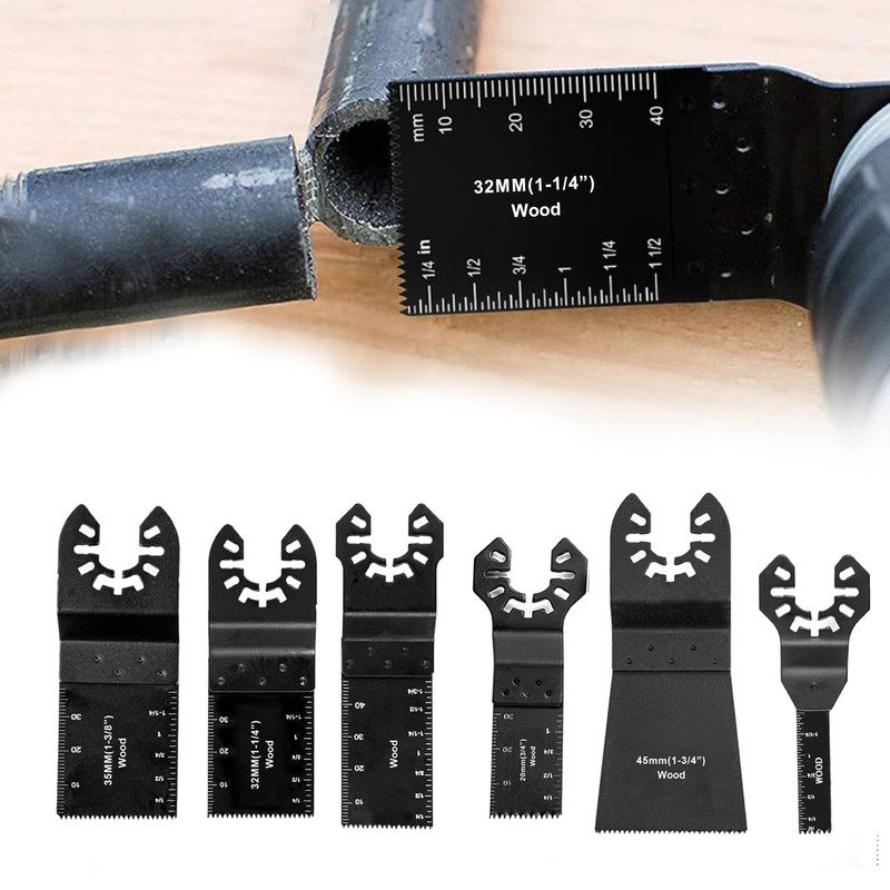 - Oscillating saw accessory set: 6-piece multi-tool saw blades set. A total of 6 different types of oscillating saw blades with blade diameters of 10 mm, 20 mm, 28 mm, 32 mm, 35 mm and 45 mm. The different blade diameters allow for different requirements when cutting wood and are ideal for use in the home textile and construction industry.