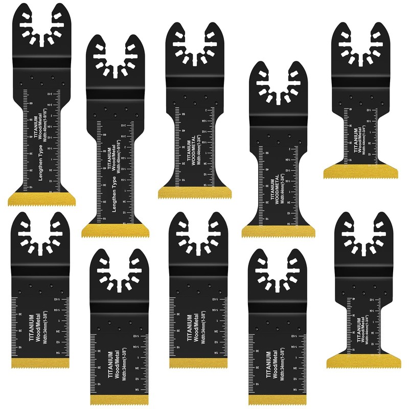 - 4 types of 10 pieces: the titanium coating oscillating saw blades contains: 2 pieces extra long 40 mm (1-9/16 inch), 2 pieces extended 44 mm (1-3/4 inch), 2 pieces 44 mm (1-3/4 inch) and 4 pieces 34 mm (1-3/8 inch). Different types of titanium oscillating multitool blades can meet different cutting requirements