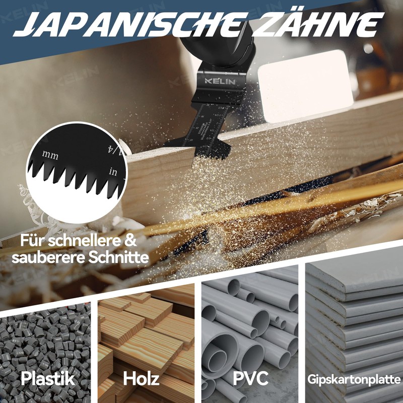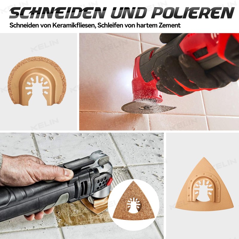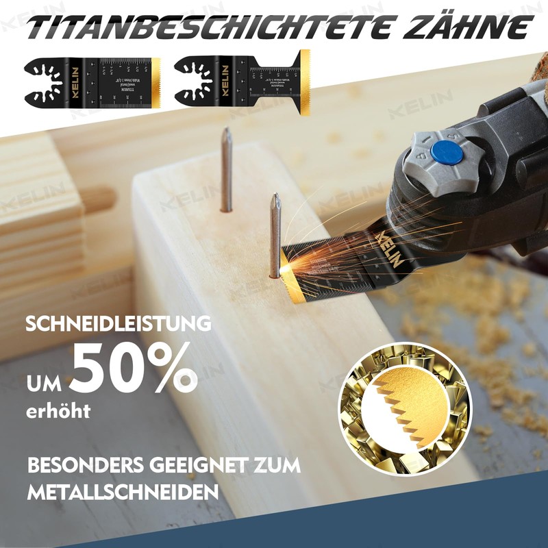- Robust and durable metal blades: The KELIN multi-tool accessory contains all the necessary material blades, e.g. titanium-coated, carbide, carbon steel and stainless steel scrapers. Each saw blade is forged by high temperature quenching, making it sharp, durable and wear-resistant.