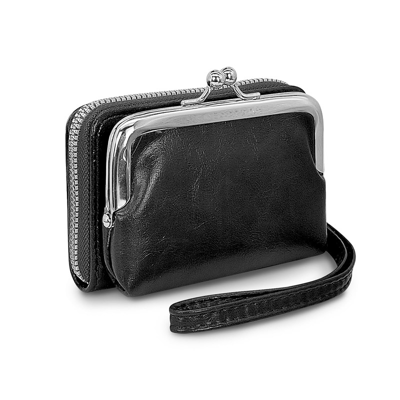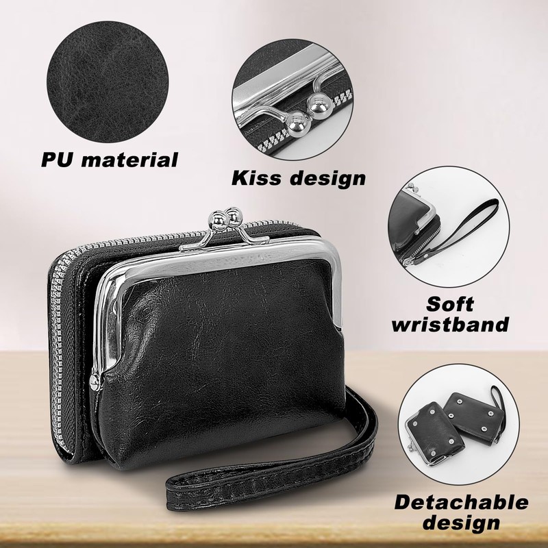 MultiValue Ladies Wallet, Large Capacity Credit Card Wallet 2 in 1 Womens Card Wallet Purse with Wrist Strap Zip Kiss Buckle Coin Wallet for Girls Women (Black)