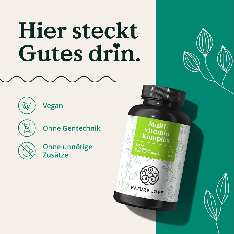 Multivitamin Komplex – 180 vegane Kapseln – Vitamine A-Z & Mineralstoffe – mit Grünteeextrakt und Citrus-Bioflavonoiden – hochdosiert und mit Bioaktiv-Formen – laborgeprüft, ohne unnötige Zusätze