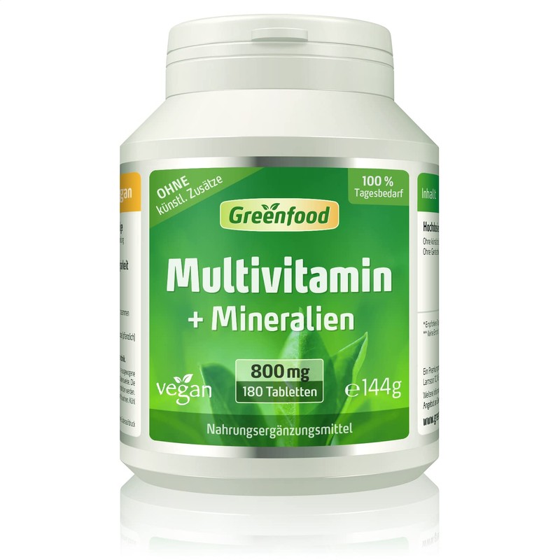 Multivitamin from Greenfood covers 100 percent the daily requirement of all vital vitamins and contains all important minerals and trace elements. This successfully plugs small and large supply gaps. For a general sense of well-being, more energy, better sleep and more balance. Ideal for those who want to ensure their basic care optimally and comprehensively - every day! Thanks to the addition of acerola extract and citrus bioflavonoids, the absorption of all vital substances is naturally promoted. Calcium, magnesium, iron, zinc, copper and manganese are available as high-quality bisglycinates, these compounds are better absorbed and utilised by the body than conventional mineral compounds.