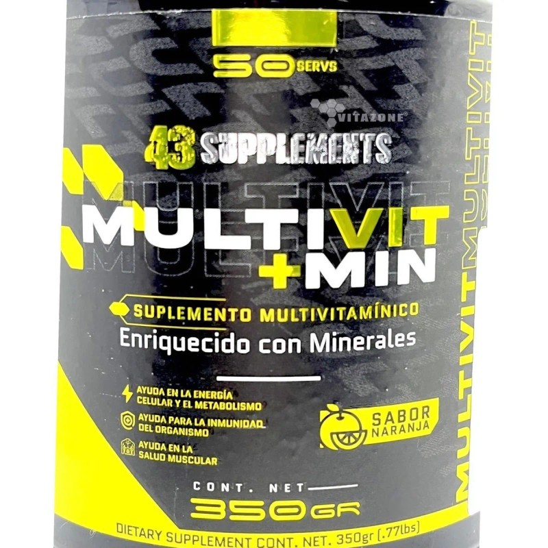 El Multivit+Min Sabor Naranja 350 gr 50 serv 43 Supplements es un producto de la reconocida marca 43 Supplements, especializada en la creación de suplementos nutricionales de alta calidad. Este multivitamínico en polvo, con un delicioso sabor a naranja, es fácil de consumir y se disuelve rápidamente en agua fría. Cada bote contiene 350 gramos del producto, lo que equivale a 50 porciones de 7 gramos cada una. A pesar de su sabor, este producto no contiene lactosa y es libre de gluten, lo que lo hace ideal para personas con dietas restrictivas. Sin embargo, no es apto para personas en período de lactancia o embarazo, ni para veganos. Los ingredientes incluyen colorantes naturales y artificiales, saborizantes, maltodextrina, sucralosa y ácido cítrico. Este producto no es un medicamento, y su consumo es responsabilidad de quien lo usa y de quien lo recomienda. Se recomienda para personas mayores de 18 años. Recuerda, la salud es lo más importante, consume responsablemente.