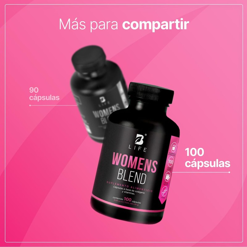 ¡Disfruta la formulación de Womens Blend B Life! Cada cápsula de 650 mg está diseñada para aportar 200 mg de Colágeno Hidrolizado y una mezcla de componentes esenciales para la mujer, como Biotina, Ácido Fólico y un Complejo de vitaminas, elementos que otras fórmulas carecen. Contiene 90 cápsulas.