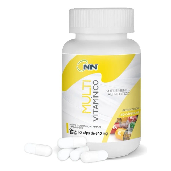 Multivitamínico Nin 60 cápsulas es un suplemento completo para quienes buscan mantener su cuerpo fuerte, activo y protegido. Su fórmula balanceada con vitamina C, vitamina D, B12, omega 3 y hierro ayuda a fortalecer el sistema inmunológico, mejorar los niveles de energía, apoyar el cerebro y combatir la fatiga diaria. 🌿⚡🧠