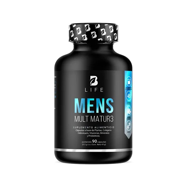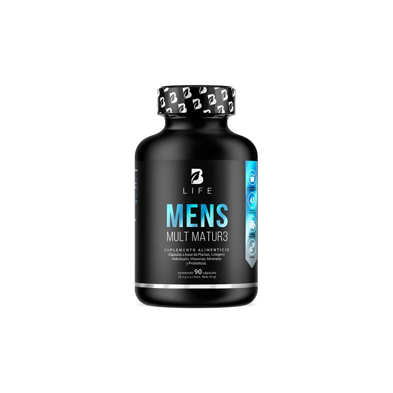 Descripción Limpia: ¡Mens Mult Matur3 B Life, tu fuerza y vitalidad! Cada cápsula de 500 mg contiene nuestra fórmula excepcional que fusiona Maca negra, Semilla de Calabaza, Creatina Monohidratada, Colágeno Hidrolizado, Calcio, Potasio, y un completo espectro de vitaminas: C, B3, B5, B12, E, B6, B2, B1, A, K y D. Además, incorporamos ingredientes clave como L-Arginina, BCAA 2:1:1, Lactobacillus Acidophilus, Ciruelo Africano, Canela, Biotina y Ácido Fólico, a diferencia de otras presentaciones que carecen de esta valiosa sinergia de ingredientes valiosos para el hombre maduro. Contiene 90 cápsulas.