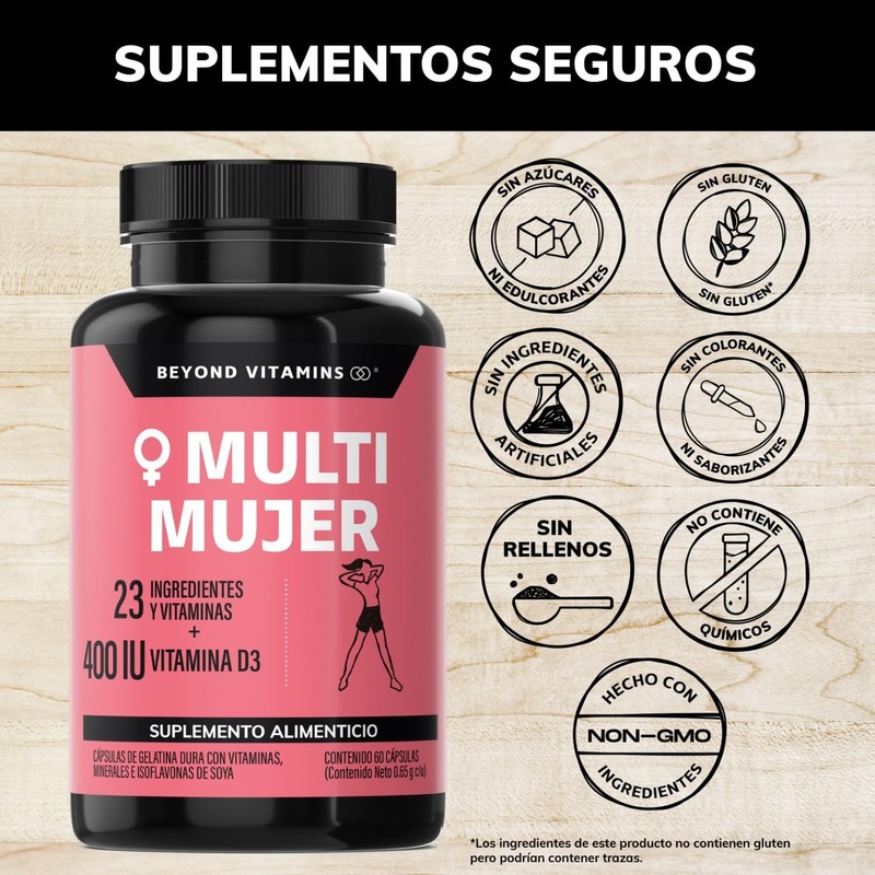 - ❌ ESTE PRODUCTO NO CONTIENE: El suplemento MULTI VITAMINAS MUJER es elaborado SIN AZÚCAR, SIN EDULCORANTES, SIN INGREDIENTES ARTIFICIALES, SIN COLORANTES, SIN SABORIZANTES ARTIFICIALES. Es un producto NON GMO (no modificado genéticamente)