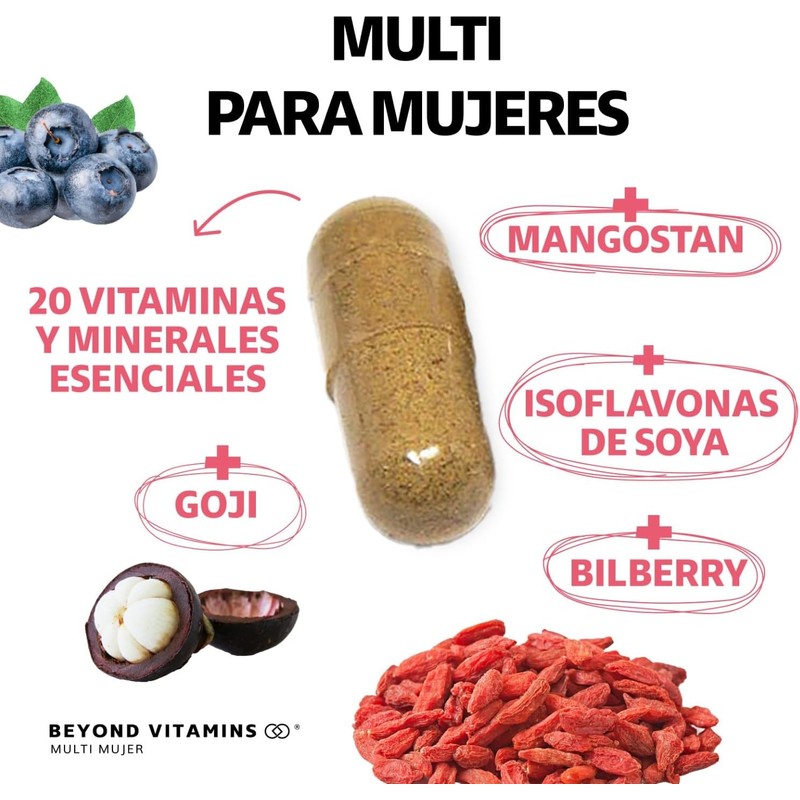 - 🙋♀️VITAMINAS Y MINERALES FORMULADOS A BASE DE SUSTANCIAS VEGETALES: El Complejo Multi+Mujer contiene 20 VITAMINAS Y MINERALES + 4 ingredientes seleccionados: ISOFLAVONAS, MANGOSTAN, GOJI y BILBERRY. Cada frasco contiene 60 cápsulas que alcanzan para 60 días!!