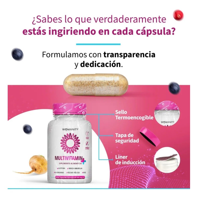 - + 100% NATURAL, VEGANO Y ORGÁNICO (LIBRE DE GLUTEN, AZÚCAR Y ALÉRGENOS) — Nuestra fórmula con Biotina, Maca Amarilla, Arándano, ácido Fólico, Vitamina B12, hierro y más, actúa en conjunto para te dará ese extra de energía que buscas y la seguridad que mereces. + INGREDIENTES NATURALES CUIDADOSAMENTE SELECCIONADOS POR SUS BENEFICIOS— Escogemos a conciencia los ingredientes que le dan a tu cuerpo justo lo que necesita. + FORMULADO CON TRANSPARENCIA Y CALIDAD — Cápsula tras cápsula estarás segura de lo que ingieres. Llevamos un control estricto de calidad en cada empaque y lote. Además, puedes consultar nuestra información disponible en nuestro empaque. + GARANTÍA DE 90 DÍAS WOMANITY — ¿Qué estás esperando para probar Multivitamin+? Todos nuestros suplementos son elaborados bajo estrictos controles de calidad. Siéntete segura: la Garantía “Ciencia con Amor” te respalda. Tienes 90 días para probar Womanity y, si por cualquier razón no te encanta, ¡te devolvemos tu dinero! Recuerda que facturamos todas tus compras