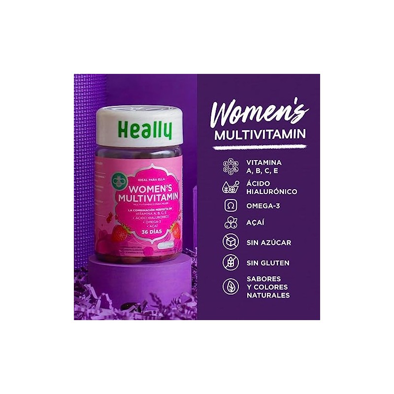 Multivitamínico para Mujer, Gomitas, Para Mayor Energía, Sabor Fresa y Granada, Con Ácido Hialurónico y Omega-3, Vitaminas A, B, C y E, 100% Natural, Sin Azúcar y Gluten, Heally