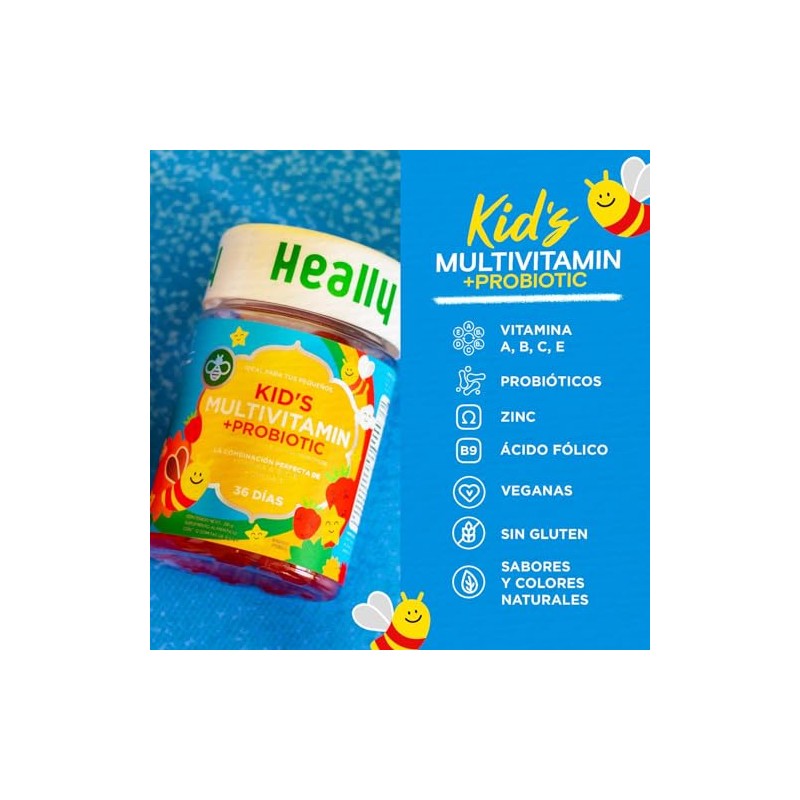 Acerca de este artículo * ✔ NUTRIENTES ESENCIALES PARA SU DESARROLLO – Nuestro multivitamínico es perfecto para complementar su alimentación en cualquier época del año y gozar de una vida más sana y alegre. Es por eso que con sólo 2 gomitas al día de nuestro multivitamínico Kid’s sabor naranja y fresa, tendrán ese boost que necesitan para crecer sanos y felices. * ✔ INGREDIENTES ACTIVOS PARA UNA VIDA SALUDABLE – Nuestro multivitamínicos están hechos con la mezcla ideal de ingredientes necesarios para brindarte una apariencia más fresca y con más vitalidad todos los días. El multivitamínico Kid’s incluye la combinación perfecta de vitamina A, C, D, E, Probióticos y Omega-3. * ✔ SÓLO CON INGREDIENTES NATURALES– Todos los multivitamínicos Heally están hechos con ingredientes 100% naturales y bajo los más altos estándares de calidad. Son libres de gluten, azúcares añadidos, grasas, colorantes y saborizantes artificiales.