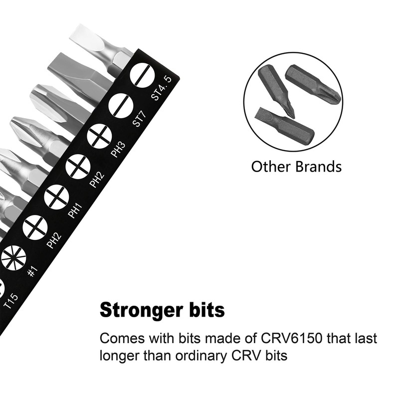 - ▲ EXTRA 10 POPULAR-SIZE BITS: Made of heavy duty CRV6150 (chrome vanadium) steel with hardness of HRC51-55, bits in this set includes #1(2pc), #2, #3 phillips head bits, #1, #2 pozidriv head bits, 4.5mm, 7mm slotted head bits, and T15, T20 torx star screwdriver bits, coming with a cartridge as a good screwdriver bit organizer
