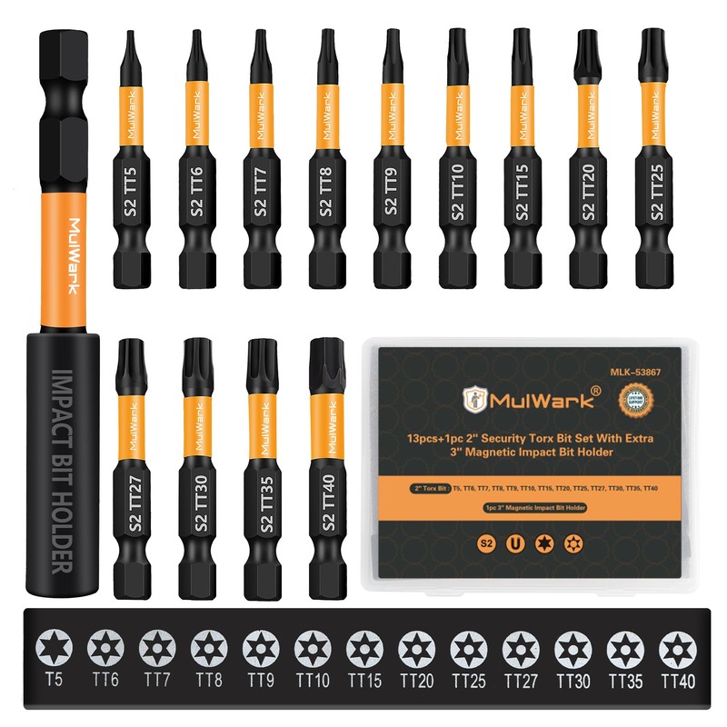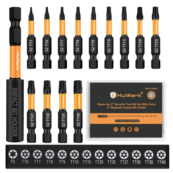 MulWark 2" Torx Bits 14pcs T5-TT40 Torx Socket Set - S2 Steel Security Torx Bit Set with Magnetic Bit Holder