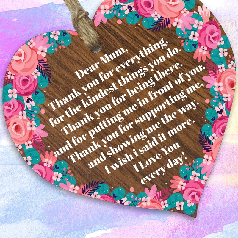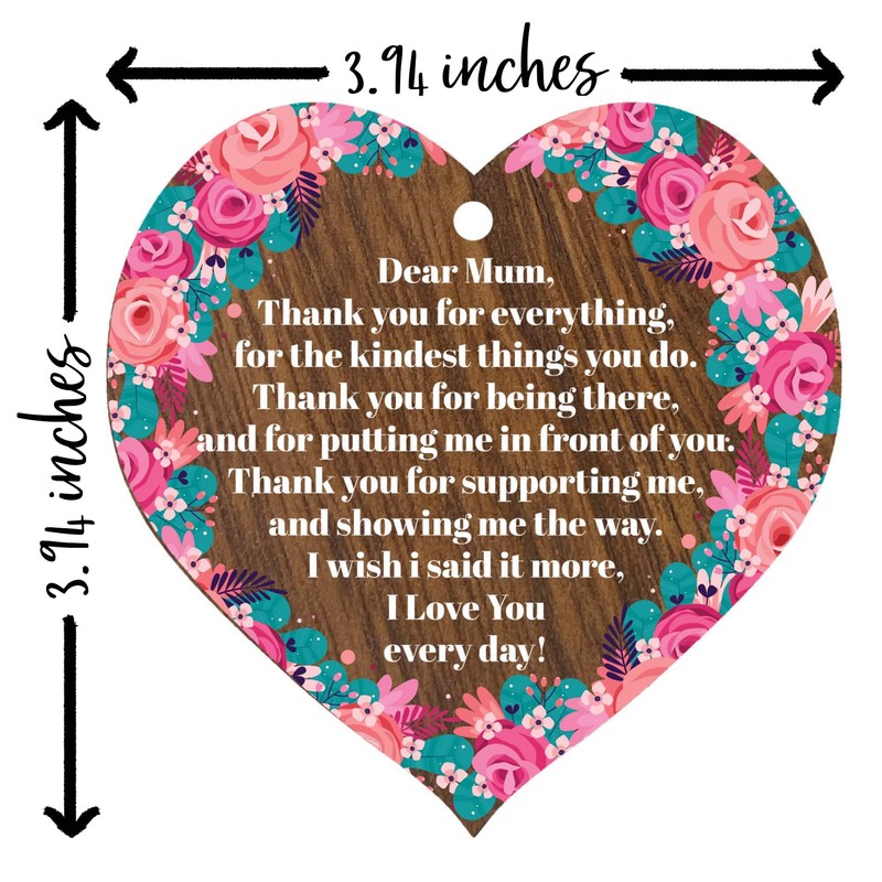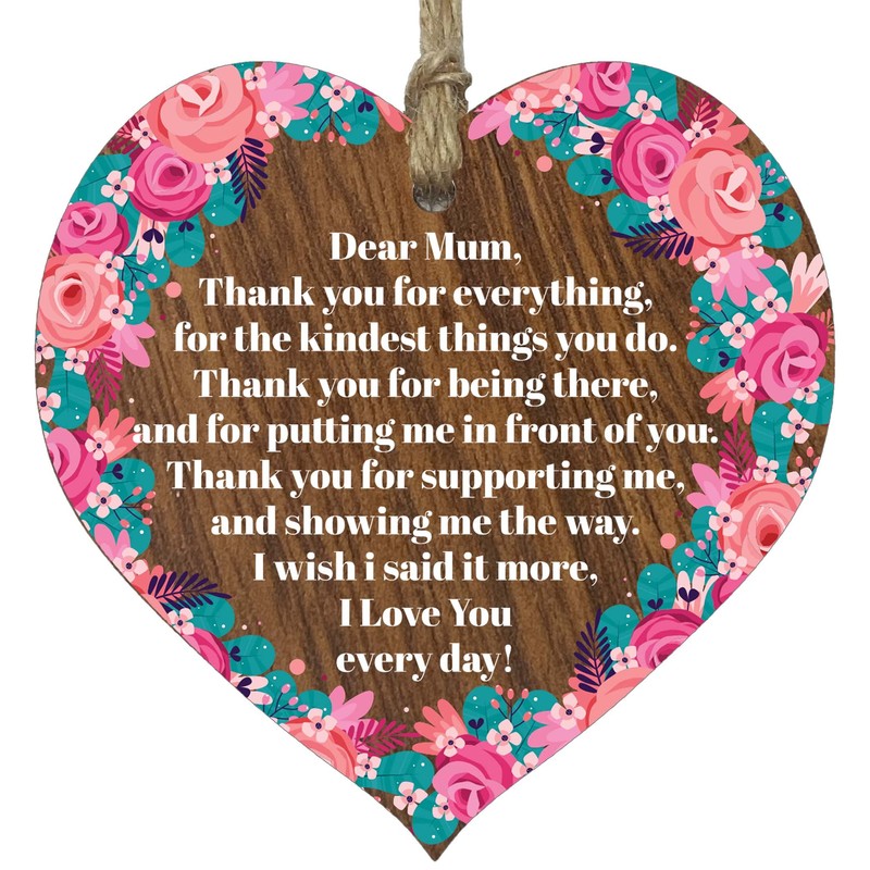 - A LITTLE SOMETHING TO MAKE MUM SMILE: These exceptional quality heart shaped wooden plaques for Mum make some of the Mum plaque gifts on the market. Great mothers birthday gifts showing the design with wording: "Dear Mum, Thank you for everything, for the kindest things you do. Thank you for being there, and for putting me in front of you. Thank you for supporting me, and showing me the way". I wish i said it more, I Love You every day!