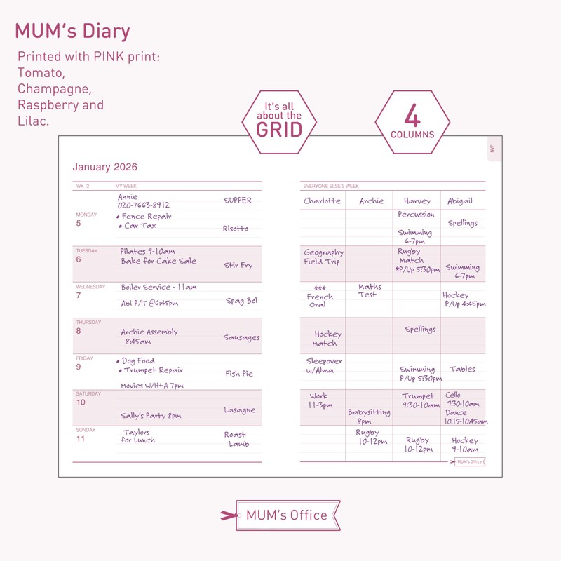 - This diary is all about the week-to-view with our GRID layout. A page for mum and 4 columns on the opposite page for everyone else. See the whole family's weekly schedule at a glance and minimise the scheduling chaos of your busy family.