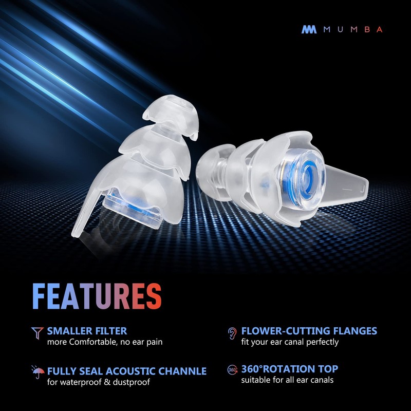 Mumba High Fidelity Earplugs contain a proprietary precision filter that provides just the right amount of sound reduction while preserving voice clarity and audio quality.You will actually hear better and still be able to talk to your friends at a loud event. The earplugs are soft, comfortable and virtually invisible.