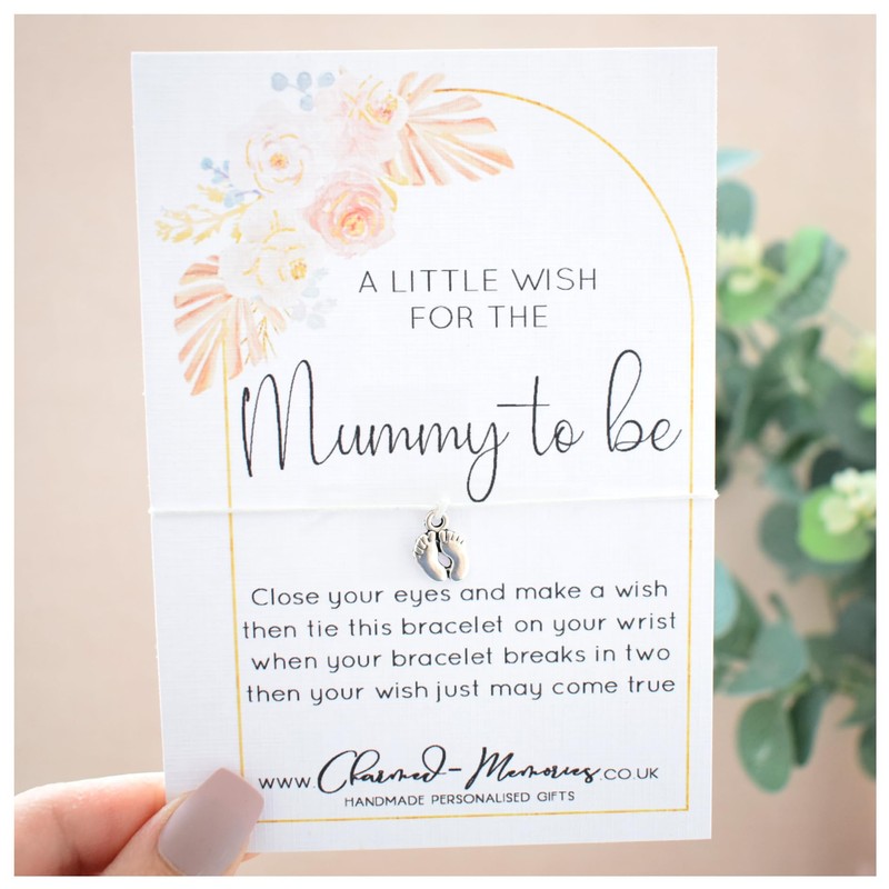 Mummy To Be Wish Bracelet | Pregnancy Congratulations. New Baby Shower Card. Modern Pampas & Rose Floral Frame. Tibetan Baby Feet Charm. Wish String Cord Bracelet. Modern Greeting Card