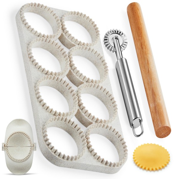 MUMSUNG Ravioli Maker Press, Ravioli Press Mold Set - Round Ravioli Stamp Maker Cutter with Wood Rolling Pin, 2.6" Empanada Maker Press Kit and Ravioli Wheel, Makes 8 Ravioli