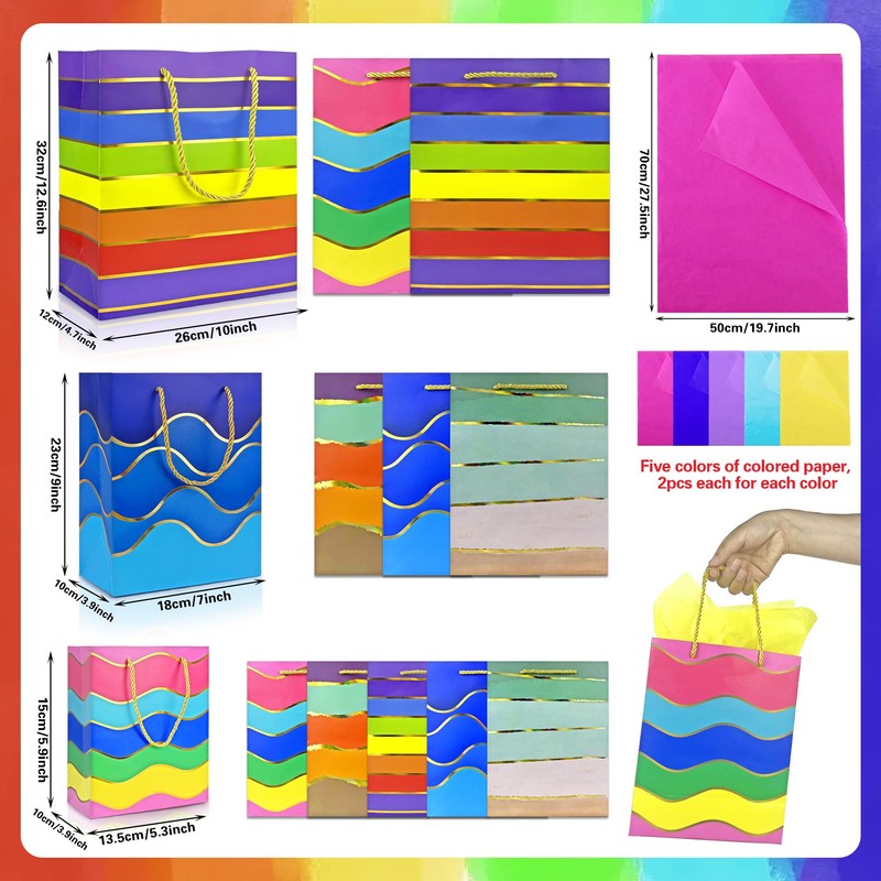 These gift bags of assorted sizes are perfect for any occasion, from birthdays to weddings and everything in between. Featuring a rainbow of bright colors, these bags are sure to put a smile on anyone's face. These rainbow gift bags are made from high-quality materials, ensuring that they will hold up under any conditions. Whether you're wrapping up a small token of appreciation or a larger gift, these bags come in a variety of sizes to suit your needs. Whether you're a party planner, a gift shop owner, or someone who loves to give presents, these gift bags are a must-have for any occasion