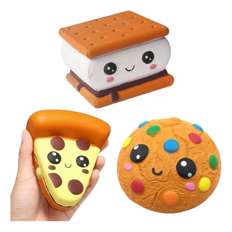 7.- Kit 3 Squishy Kawaii Olor Anti-estrés Pizza Galleta Mordisco