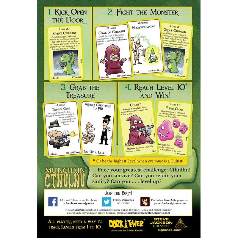 Now available . . . another stand-alone Munchkin game! Munchkins have hacked their way through dungeons, kung fu temples, starships, haunted houses, and super-foes. Now they face their greatest challenge – Cthulhu! Will they survive? Will they retain their sanity? Will they . . . level up? Munchkin Cthuhlu is a stand-alone game in the Munchkin line, this time lampooning Lovecraft's Mythos and the horror gaming that surrounds it. Brought to you by Steve Jackson and John Kovalic, this set features four new Classes – including the Cultist – and a lot of classic monsters from outside reality. And they all have Stuff you can take from their twitching bodies. You can play Munchkin Cthulhu by itself, or combine it with any number of other Munchkin games for mind-bending silliness.