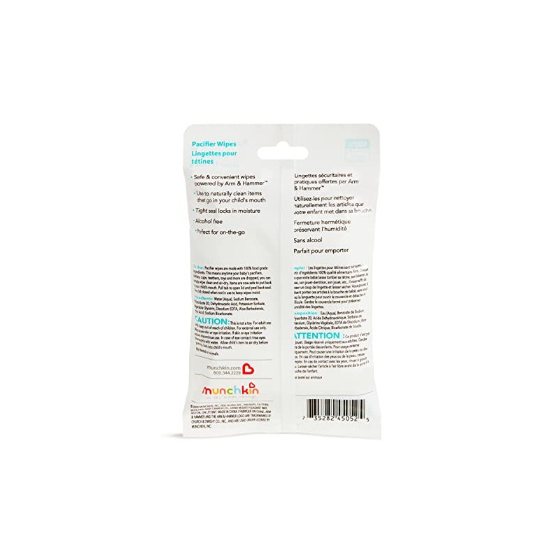 Product DescriptionCleaning baby's favorite pacifiers and teething toys is a breeze with Arm and Hammer Pacifier Wipes. This convenient pack of 36 wipes is great for home use and on the go. Cleans bottles, pacifiers, teething toys, cups and more quickly, safely and naturally without harsh chemicals or alcohol. 100% Food grade.Brand StoryBy MunchkinFrom the ManufacturerCleaning baby's favorite pacifiers and teething toys is a breeze with Arm and Hammer Pacifier Wipes. This convenient pack of 36 wipes is great for home use and on-the-go. Cleans bottles, pacifiers, teething toys, cups and more quickly, safely and naturally without harsh chemicals or alcohol. 100% Food grade.