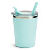 - Durable double-walled stainless steel toddler cup with spill proof straw and open sipper lid with slider