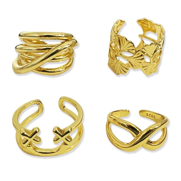MUNIGSMUR 18K Gold Plated Chunky Ring Set for Women Open Adjustable Non Tarnish Statement Twist Ring & Olive Leaf Ring & Smile Ring & Cross Ring with Jewelry Box